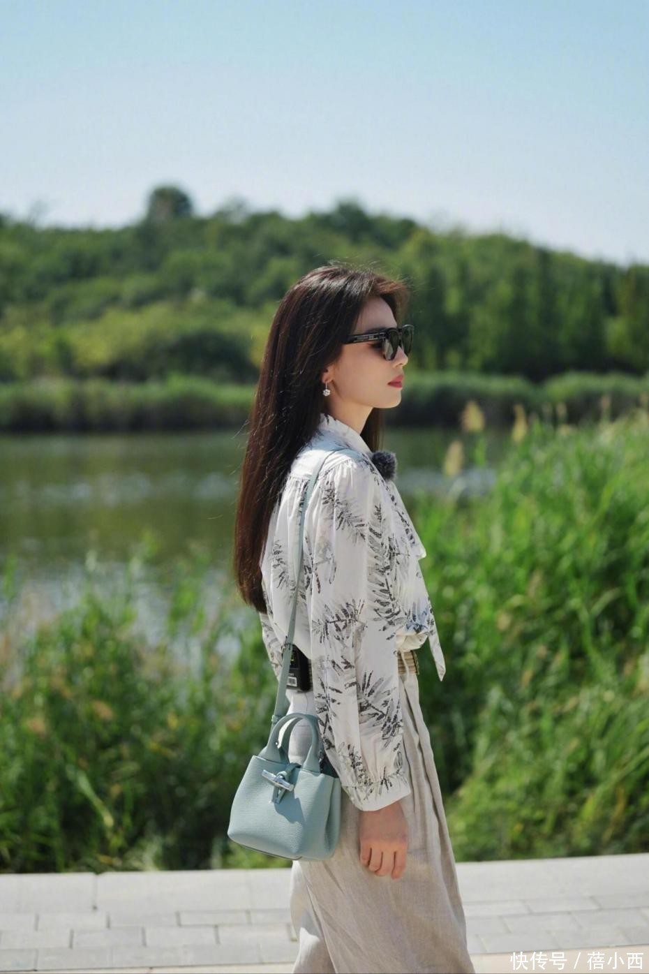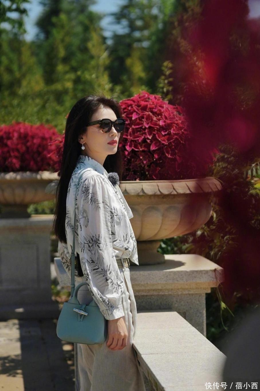 哪怕是看上去像灯笼袖,也能拥有减龄效果。这款衬衫面料看起来是轻薄的雪纺或者类似材质,垂感挺好的,当风吹过来时衣袖会产生飘逸感。有的雪纺衬衫带点透透的感觉,所以时髦精穿时会搭背心、吊带。肩膀背了一款浅薄荷绿色的包包,属于简约款。