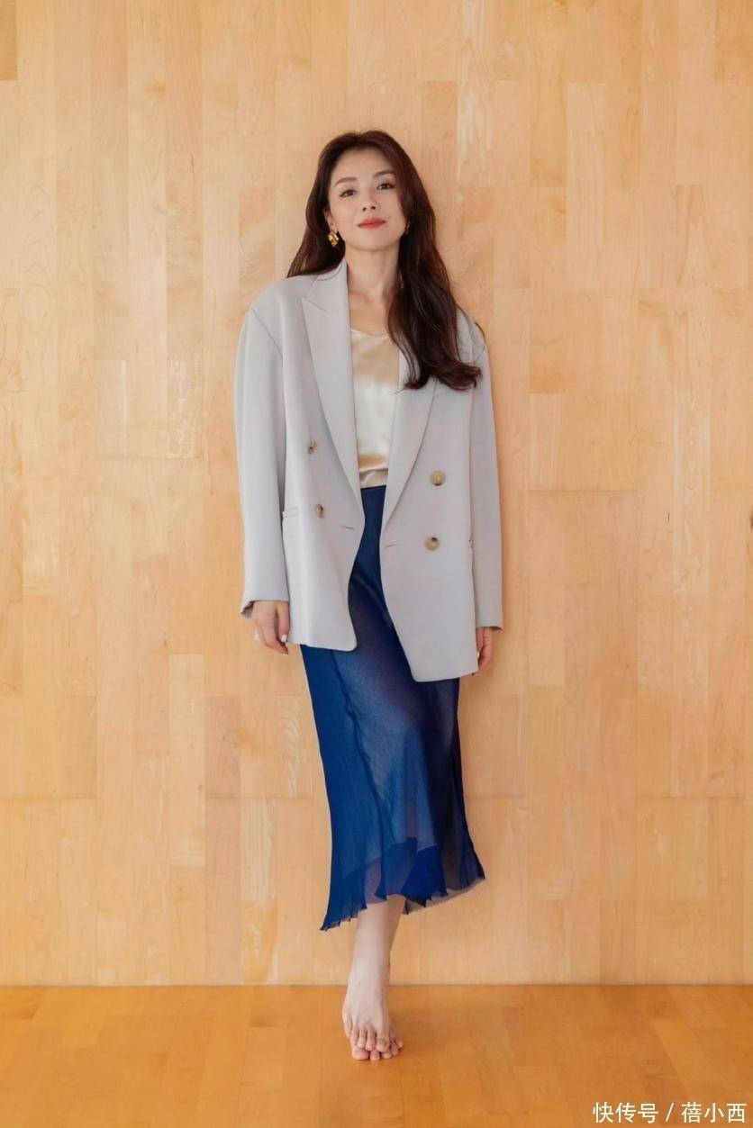 大胆猜测,外套里边是一条香槟色的缎面吊带,缎面的光泽感十分明显,在光线下会反光,而且看上去特别丝滑,让人忍不住想摸几下。吊带领子露肤度不错,不会遮住锁骨,进而让整体穿搭多了性感韵味。蓝色半身裙是那种不规则的鱼尾裙摆,能看见两层面料,都具有轻薄特点,走路的时候应该很飘逸。半身裙的挺色很浓郁,与西装外套、内搭形成了强烈对比,一下子就把视觉重点拉到了腿上。