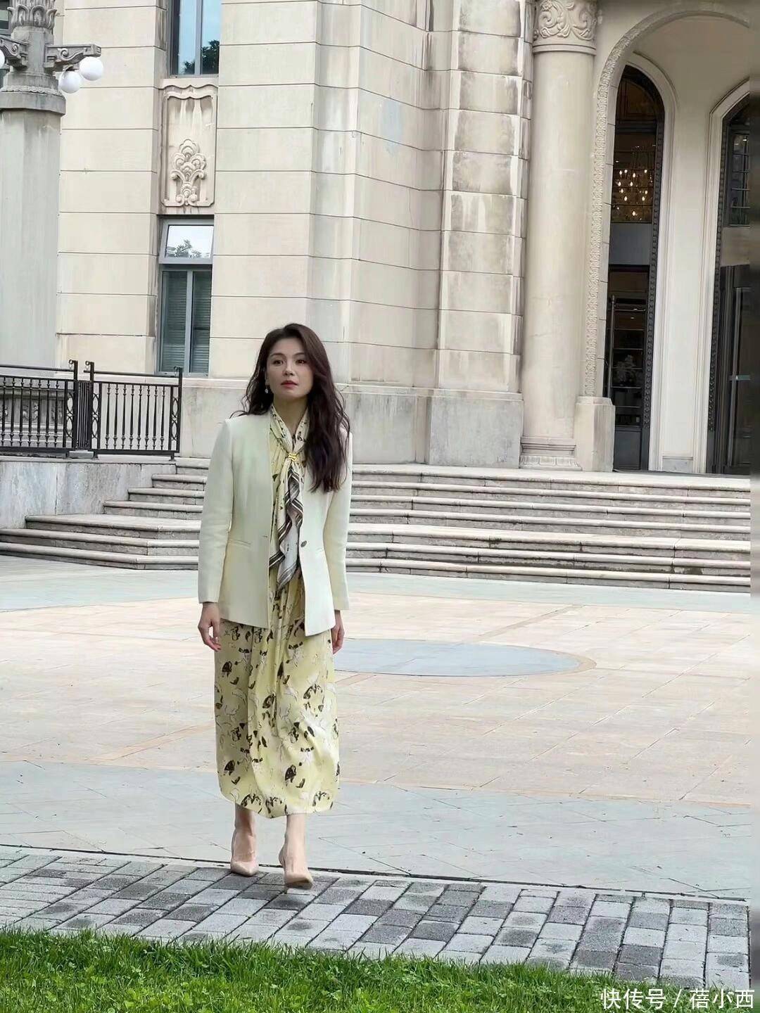 米白色西装外套有点修身,对勾勒上半身线条很有帮助。淡黄色连衣裙的底色是柔和的奶黄,上面印着较为抽象的图案。用西装搭连衣裙,会让你拥有温柔又干练的气质,像是职场里又美又飒的小姐姐。